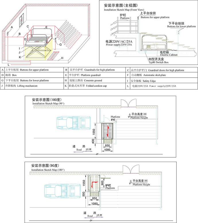 安裝方式:無基坑式安裝,直接固定于混凝土地面(無底坑室外應(yīng)用情況下,平臺(tái)下方混凝土地面不得低于周圍地面)