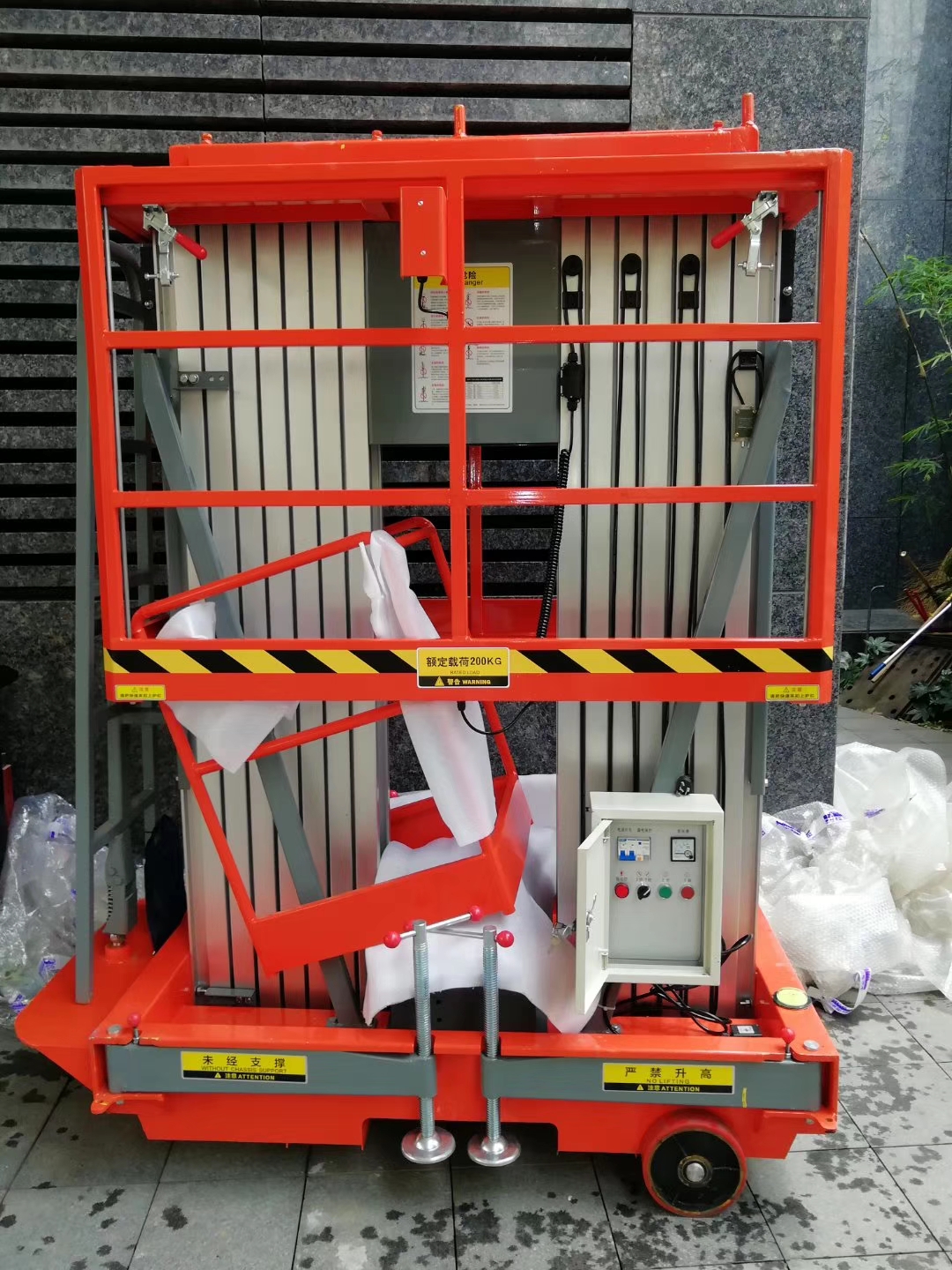 雙桅柱系列高空作業平臺,主結構采用優質高強度鋁制擠壓型材制成,適用于雙人同時登高作業。